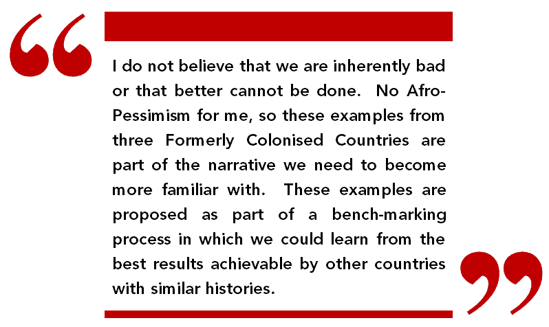I do not believe that we are inherently bad or that better cannot be done. No Afro-Pessimism for me, so these examples from three Formerly Colonised Countries are part of the narrative we need to become more familiar with. These examples are proposed as part of a bench-marking process in which we could learn from the best results achievable by other countries with similar histories.